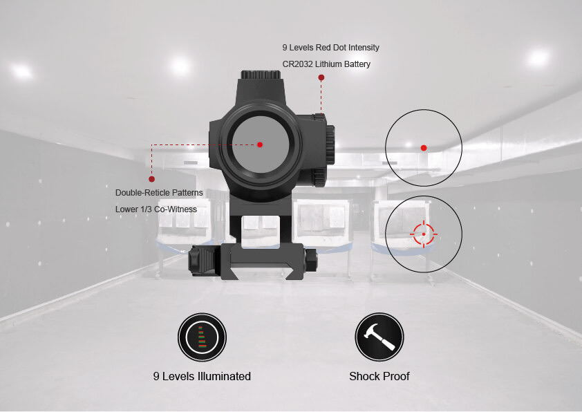 Cantilever vysoká montáž je řešena jako Lower 1/3 Co-Witness, tedy výška středu optiky je 38 mm nad základnou montáže, což umožňuje bezproblémové použití s mechanickými mířidly. Kolimátor má paralaxu pod 2 MOA, takže bod zůstává přesně na cíli bez ohledu na pozici oka. Odolné tělo z hliníkové slitiny 6061-T6 s matnou povrchovou úpravou zaručuje dlouhou životnost i při intenzivním použití. Boční schránka na baterii umožňuje její výměnu bez nutnosti znovu nastřelovat kolimátor.