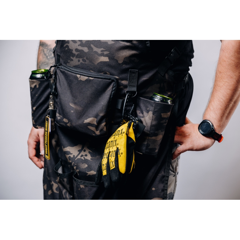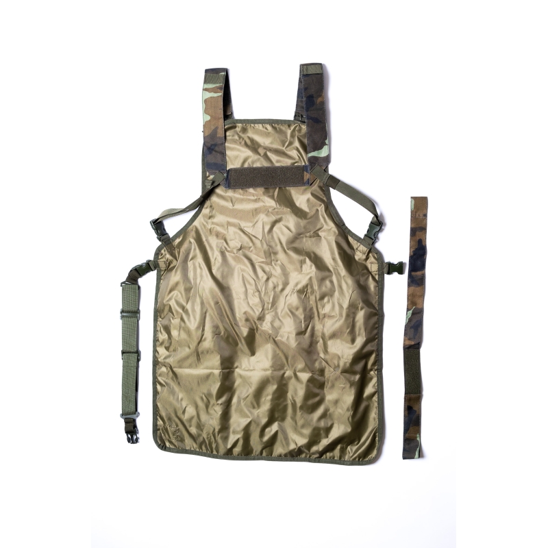 Zástěra se nosí velmi pohodlně i zatížená díky ramennímu postroji (harness) ve tvaru písmena H.