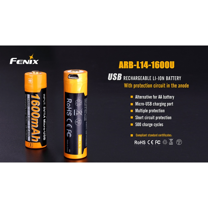 Nabíjecí baterie Fenix ARB-L14-1600U slouží jako náhradník klasických tužkových AA baterií. Uvnitř se jedná o Li-ion článek, který je vybaven regulační elektronikou, která v průběhu vybíjení drží výstupní napětí 1,5 V. Akumulátor je tedy zvláště vhodný do přístrojů, které jsou citlivé na výši napětí a například s nabíjecími NiMH nepracují správně, nebo jen na krátkou dobu. Kapacita akumulátoru je 1600 mAh (2,4 Wh což odpovídá kapacitě 2000 mAh u NiMH).