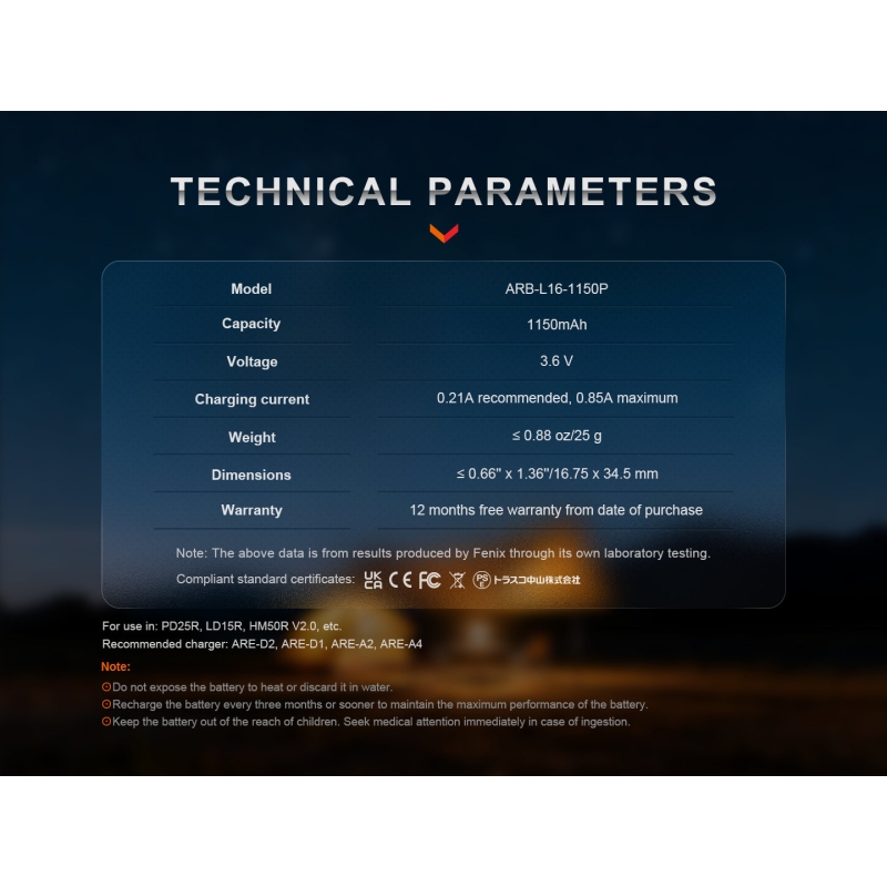 Fenix nabíjecí Li-ion baterie RCR123A (ARB-L16-1150P) ve žluto-černém provedení nabízí kapacitu 1150 mAh pro svítilny a čelovky s vyšším odběrem 3,6 V. Disponuje ochranou proti přebití, podbití, zkratu a přehřátí a navíc PTC ventilem proti explozi pro maximální bezpečnost. Malá, ale výkonná baterie. Lze použít jako náhradu za CR123A nebo 16340.