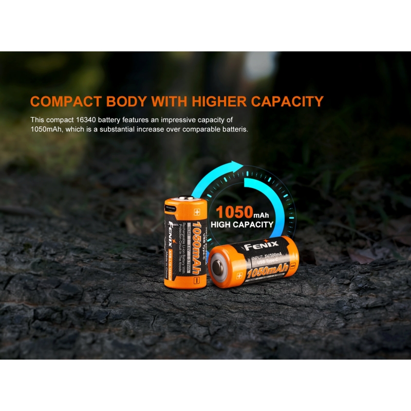 Fenix ARB-L16-1050UP je moderní Li-ion akumulátor formátu RCR123A (16340), který kombinuje kompaktní rozměry, vysoký výkon a maximální dostupnost nabíjení. Díky integrovanému USB-C konektoru jej můžete nabíjet přímo kabelem bez nutnosti externí nabíječky, zároveň však zůstává kompatibilní i s klasickými nabíječkami a svítilnami s funkcí nabíjení. Baterie je navržena pro vyšší proudový odběr, takže bez problémů napájí výkonné LED svítilny řady Fenix E a čelovky řady HM a další zařízení. Samozřejmostí je vícestupňová ochranná elektronika, která chrání článek proti přebití, hlubokému vybití, zkratu i přehřátí. Bezpečnost doplňuje PTC ochrana a přetlakový ventil, které zabraňují poškození při extrémním zatížení. Akumulátor nemá paměťový efekt a vyznačuje se nízkým samovybíjením, takže si udrží energii i při delším skladování.