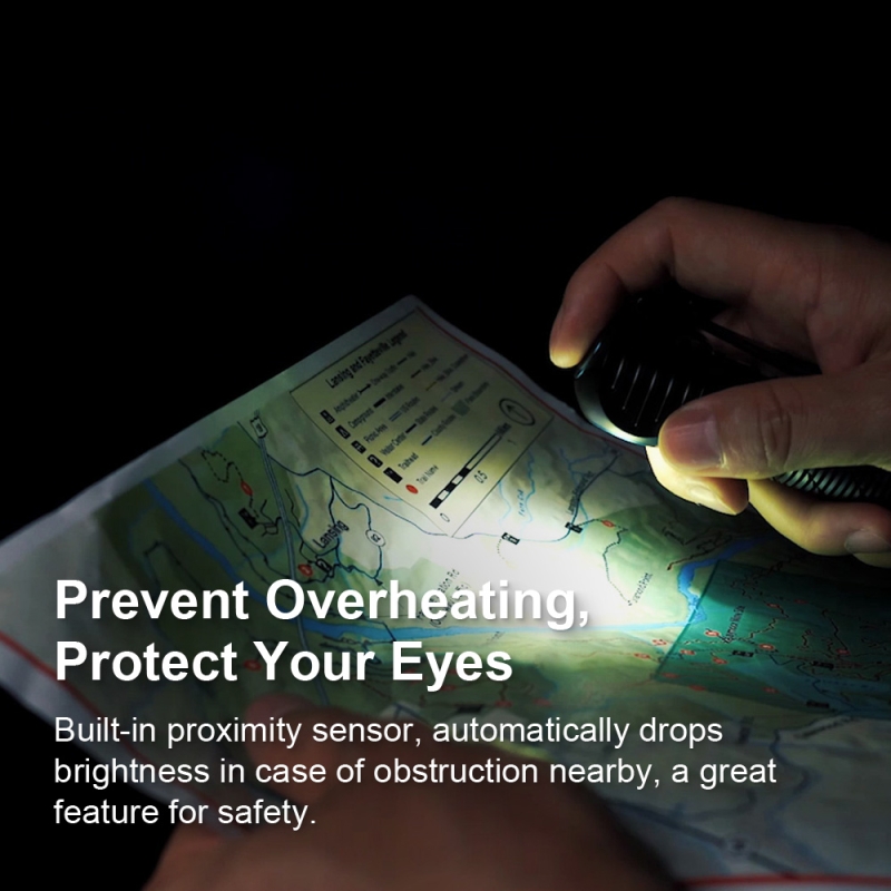Čelovka je vybavená bezdotykovým senzorem, díky kterému se automaticky sníží světelný výkon, když se hlava čelovky přiblíží k objektu.