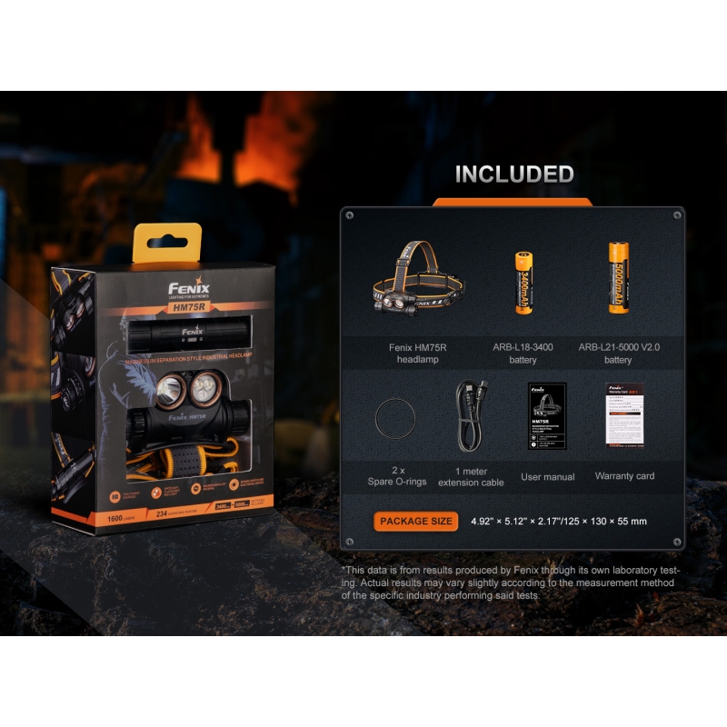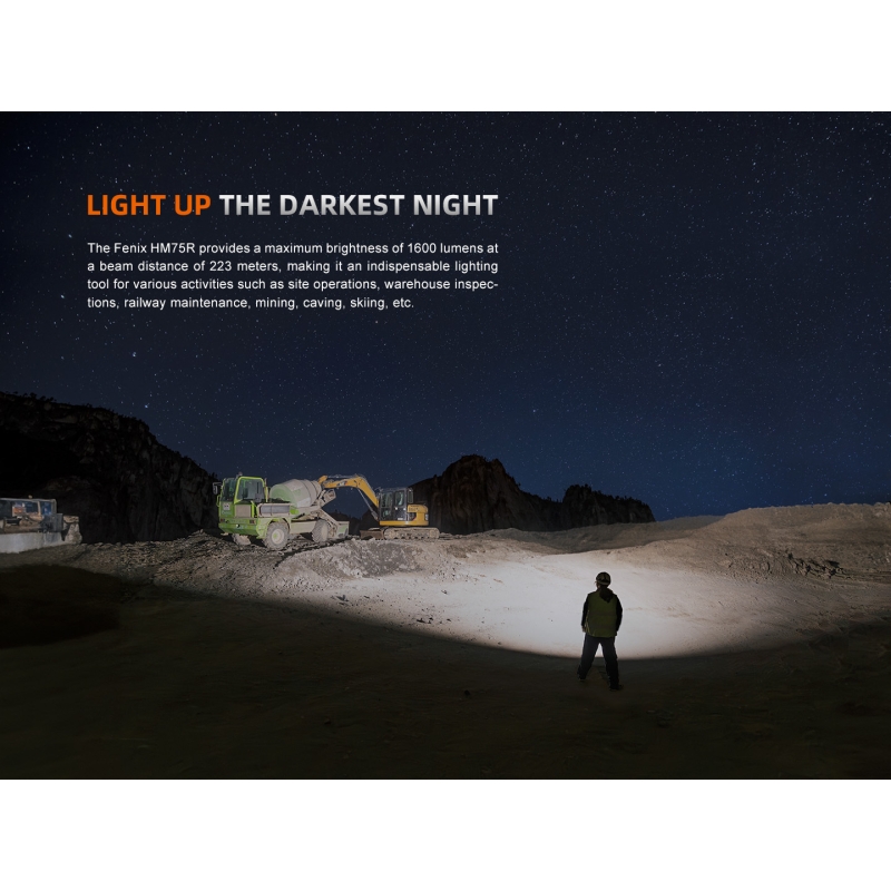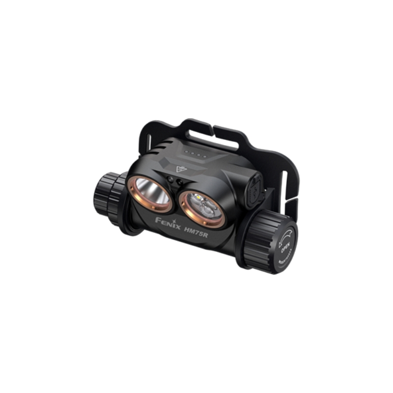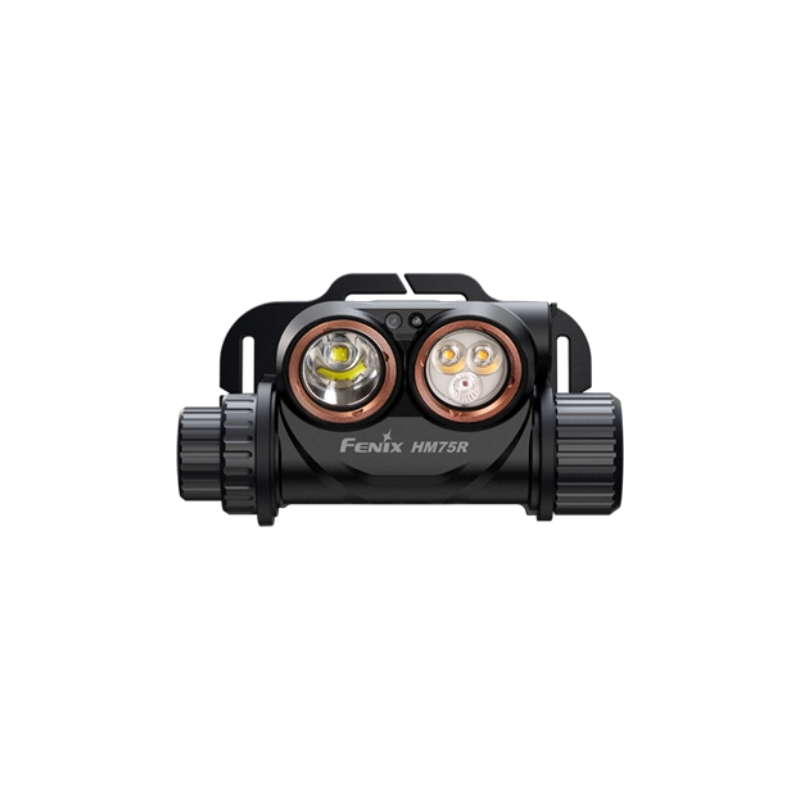 Fenix HM75R je robustní čelovka s dálkovým i širokým reflektorem a silným červeným světlem. Výkonná bílá dioda LED Luminus SST-40 nabídne dosvit až 223 metrů, široký reflektor s LED SST-20 poskytne neutrální odstín světla s rozptylem do 60 m. Výkon je až 1600 lumenů, k dispozici je 12 režimů svícení včetně 4 režimů červeného světla. Napájení zajišťuje Li-ion akumulátor 18650 v těle svítilny a přídavná odnímatelná powerbanka 21700 uchycená na týlu popruhu. Obě baterie jsou součástí balení.