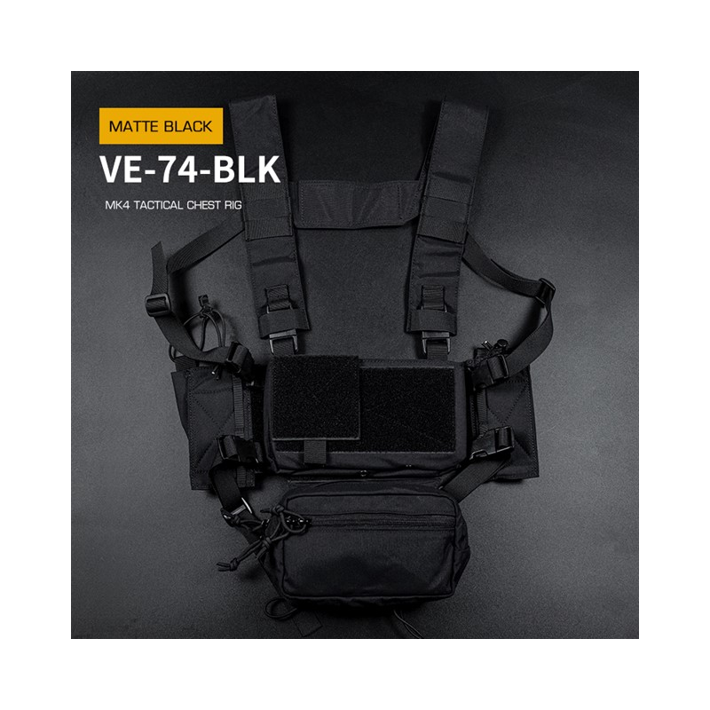 Větší pole suchého zipu také umožňuje připnutí na nosiče plátů. Chest rig MK4 je opatřen pevným H řemením s MOLLE vazbou vpředu nad chest-rigem (pro PTT tlačítka a další vybavení) a bederním popruhem se sponami.