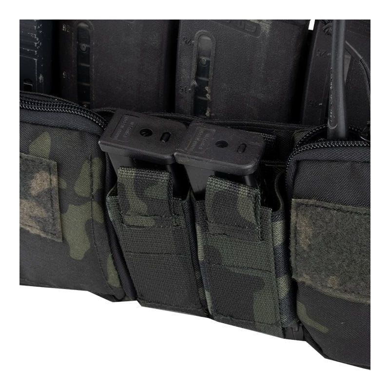 Pod předními sumkami se nachází vnitřní přihrádka se suchým zipem, která je ideální pro vložení elastických insertů pro zásobníky (nejsou součástí). Do bočních pružných poutek lze umístit např. chemická světla nebo psací potřeby. Nosné popruhy typu H jsou jednoduché, bez polstrování, ale s MOLLE vazbou pro doplňky. Díky rychloupínacím přezkám lze rig během chvíle připevnit k nosiči plátů, který je kompatibilní se systémem VX Buckle-Up např. VX Buckle-Up Gen2. Pod rig lze také připevnit podvěsnou kapsu VX Dangler nebo VX Scrote pomocí zadního VELCRO panelu.