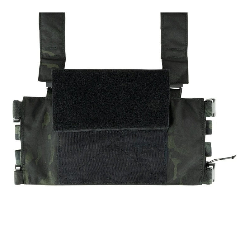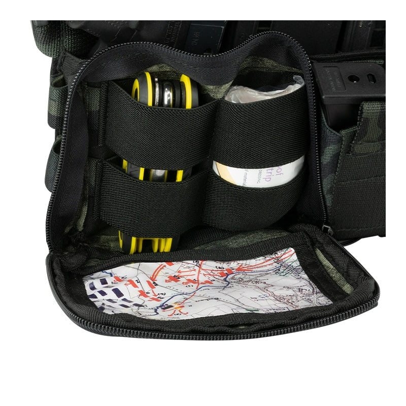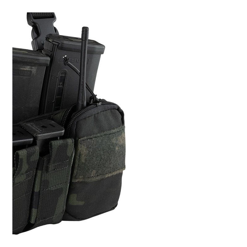 VX Buckle-Up Ready Rig od značky Viper Tactical je lehký, nízko-profilový chest-rig, který vyniká svou modularitou a kompatibilitou s balistickými vestami i samostatným použitím. Je určený pro ty, kdo potřebují rychlý přístup k zásobníkům a příslušenství bez nadbytečné hmotnosti. Přední část tvoří otevřená dvojsumka z pruženky, ideální pro pistolové zásobníky, svítilnu nebo multifunkční nářadí. Levá menší kapsa na zip poslouží například pro radiostanici, zatímco pravá zipová kapsa je vybavena vnitřní pruženkou pro fixaci vybavení a průhledným okénkem na mapu. Obě kapsy mají VELCRO panely pro nášivky.