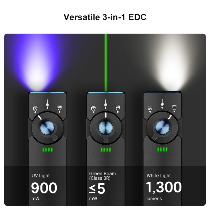 Svítilna Olight Arkfeld Pro UV 1300 lm představuje průlom ve světě přenosných svítilen, disponuje totiž integrovaným zeleným laserem a možností přepnutí na UV světlo, což ji činí ideální pro široké spektrum využití. Její unikátní plochý design s klipem na opasek umožňuje snadné přenášení a rychlé použití. Svítilna nabízí výjimečný výkon až 1300 lumenů a pět úrovní osvětlení, které lze jednoduše ovládat centrálním tlačítkem. Tento model také obsahuje indikátor nabití baterie pro lepší pohodlí uživatele.