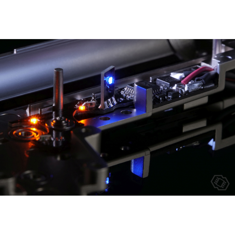 Uvnitř zbraně se nachází zesílený E&L mechabox V3 s QSC rychlou výměnou pružiny a procesorová jednotka GATE ASTER SE V3, která se stará o bezpečné spínání spouště při výstřelu a ochraňuje tak vnitřní díly, zlepšuje reakci spouště a prodlužuje životnost baterie. Zvyšuje také kadenci zbraně (RoF) a umožňuje bezpečné používání Li-Pol baterií 11.1V. Jako bonus umí nastavit citlivost spouště, pre-cocking a samozřejmě různé režimy střelby. Uvnitř mechaboxu jsou nadstandardní vnitřní díly jako sada ocelových kol v rychlostním poměru 13:1 pro ideální poměr kadence a odolnosti, 9mm ocelová ložiska v konfiguraci 2x kluzná a 4x kuličková, zesílený píst se 3 ocelovými zuby, POM tryska s těsnícím o-kroužkem, ocelový válec s integrovanou hlavou válce a postříbřená nízko-odporová kabeláž. Konfiguraci doplňuje kovová hop-up komora AK s přesnou vnitřní hlavní o průměru 6,04 mm a zátěžový neodymový motor s krátkou osičkou.
