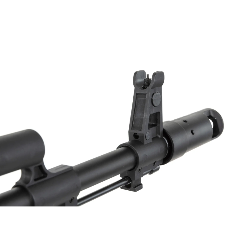 AEG puška Specna Arms AKS-74 řady J-Series CORE™ Gen.2 v černém provedení s plastovým pažbením v imitaci dřeva.