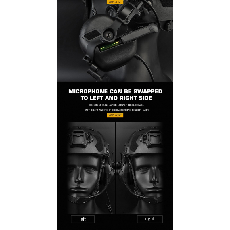 Aktivní headset Gen 5 s montáží na helmu FAST od firmy WoSport je vybaven bilaterálním mikrofonem, který lze připnout na levou i pravou sluchátkovou mušli. Tento inovativní systém aktivního odposlechu tlumí zvuky nad 90 dB a naopak zesiluje řeč, což umožňuje uživateli lépe vnímat prostředí a komunikovat s ostatními členy týmu.
