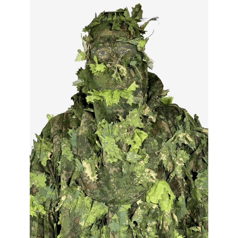 KMCS Balaclava s náhodně rozmístěnými realistickými 3D listy perfektně skryje každý obličej, navíc s prodlouženým vousem vyniká efektem snížení stínů, které uživatele často prozradí zkušenějším pozorovatelům. Prodloužené vousy stahají až po hrudník, takže neodhalí krk ani siluetu postavy. Temeno hlavy je porostlé 3D listy pro napodobení větve či pařezu v lese.