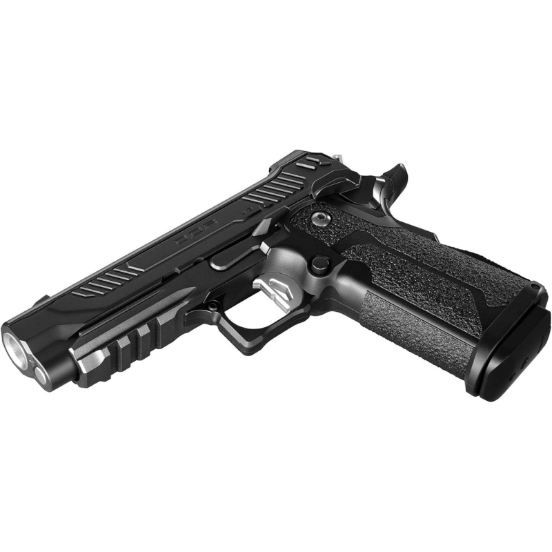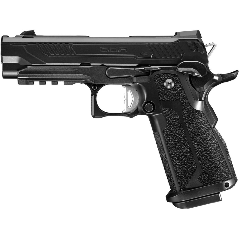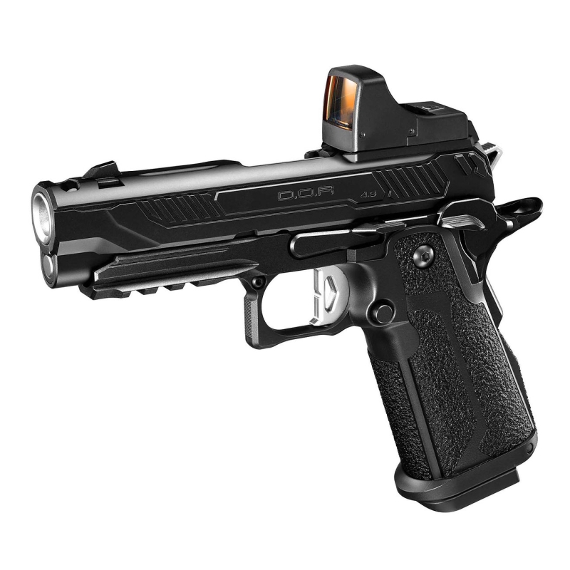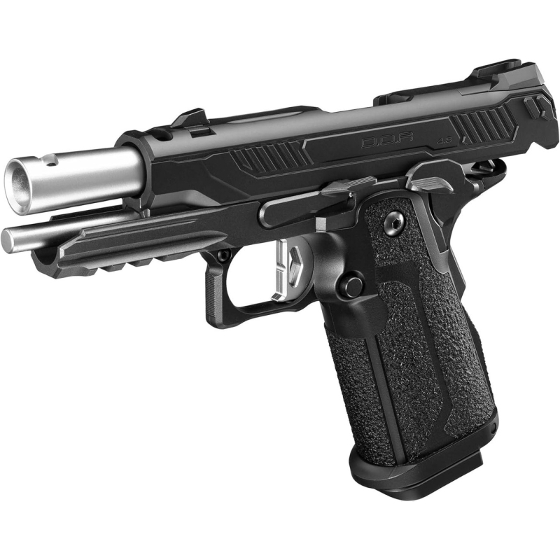 Model D.O.R (Direct Optics Ready) umožňuje přímou instalaci volitelného kolimátoru Micro Pro Sight po demontáži zadního hledí. Součástí balení je nízká i zvýšená montážní základna, přičemž vysoká varianta obsahuje záložní mechanická mířidla použitelná po sejmutí kolimátoru ze zbraně. Nově tvarovaný 4,3" závěr s předními drážkami a zvýšenými hřbety zlepšuje manipulaci i při montáži optiky. Krátká plochá spoušť (Flat trigger) a prodloužený záchyt závěru společně přispívají k lepší manipulaci se zbraní. Dynamický plynový blowback (GBB) nabízí výrazný zpětný ráz a realistický chod závěru včetně zastavení při prázdném zásobníku. Osvědčený vnitřní mechanismus TM Hi-Capa zajišťuje stabilní cyklus, spolehlivý výkon a nepřeberné množství dostupných upgrade dílů. Kovová výztuha v oblasti záchytu závěru snižuje opotřebení a prodlužuje životnost závěru bez omezování na Light Gas plyny nebo investice do kovového závěru. Pistole má tedy polymerový protiskluzový rám i závěr, proto není vhodná pro silné plyny jako Red Gas, ale nejnovější generace plynovek Tokyo Marui již zvládají standardní plyn typu Green Gas, se kterými nabízí solidní výkon až 90 m/s. Za teplejšího počasí nad 20-25 °C přesto doporučujeme používat Light Gas plyn pro vyšší životnost vnitřních dílů.