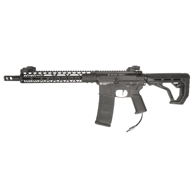 Delta Armory přichází s novou generací pušek FREYA se špičkovým HPA Enginem Pulsar D (dvojitý selenoid) a nejvyspělejší jednotkou GATE TITAN II Bluetooth Expert. Vše je pečlivě sestavené a odladěné pro maximální výkon i životnost. GP R15 FREYA je útočná puška na bázi ikonické AR-15 (M4) s licencí výrobce Grandpower. Jedná se samozřejmě o celokovovou repliku, která se navíc pyšní moderním designem těla zbraně z návrhářských dílen na Slovensku. Pokud jste fanoušci HPA zbraní typu AR15 a zároveň hledáte unikátní design, který nezapadne mezi všechny ty osázené M4 a MK18 na každé akci. A také si rádi koupíte pečlivě sestavenou zbraň bez nutnosti okamžité návštěvy servisu, aby byla konkurenceschopná. Poté pro vás bude FREYA opravdu vaše "milovaná" AR-15 (Freya je v severské mytologii krásná bohyně z rodu Vanů, její jméno v překladu znamená "Milovaná"). Novinkou u řady GP FREYA R15 HPA je pažba Delta Stock v.2, která byla navržena s ohledem na moderní ergonomii a pohodlí střelce. Její úhel zkosení a silná gumová patka nebrání nošení nosiče plátů a usnadňují míření v různých střeleckých pozicích. Nová pažbička Delta QRS v.2 nabízí nejen lepší vzhled, ale i ergonomii. Celá GP FREYA AR15 se může pyšnit celokovovou konstrukcí, což zahrnuje tělo zbraně, předpažbí, hlaveň s vnějším levotočivým 14- mm závitem (CCW), tubus pažby a další vnější prvky (mimo pažbu, pažbičku a zásobník). Model GP FREYA R15 SKELETON 13" HPA disponuje CNC předpažbím typu SKELETON M-LOK o délce 13" palců (330 mm). Na zbrani najdete hned několik bodů pro uchycení popruhu (QD otvory na předpažbí a pažbě a klasická oka pod tubusem pažby). Milovníky Mil-Sim a reálných replik zbraní potěší ražení zbrojovky Grandpower na těle zbraně. Pro plnou funkčnost systému vám zbývá jen dokoupit HPA regulátor, HPA lahev, HPA hadici a HPA micro baterii s konektorem JST. Pro více informací o výhodách a nevýhodách HPA systému, o tom, na co si dát pozor, si přečtete náš článek Jak si poskládat HPA sestavu.
