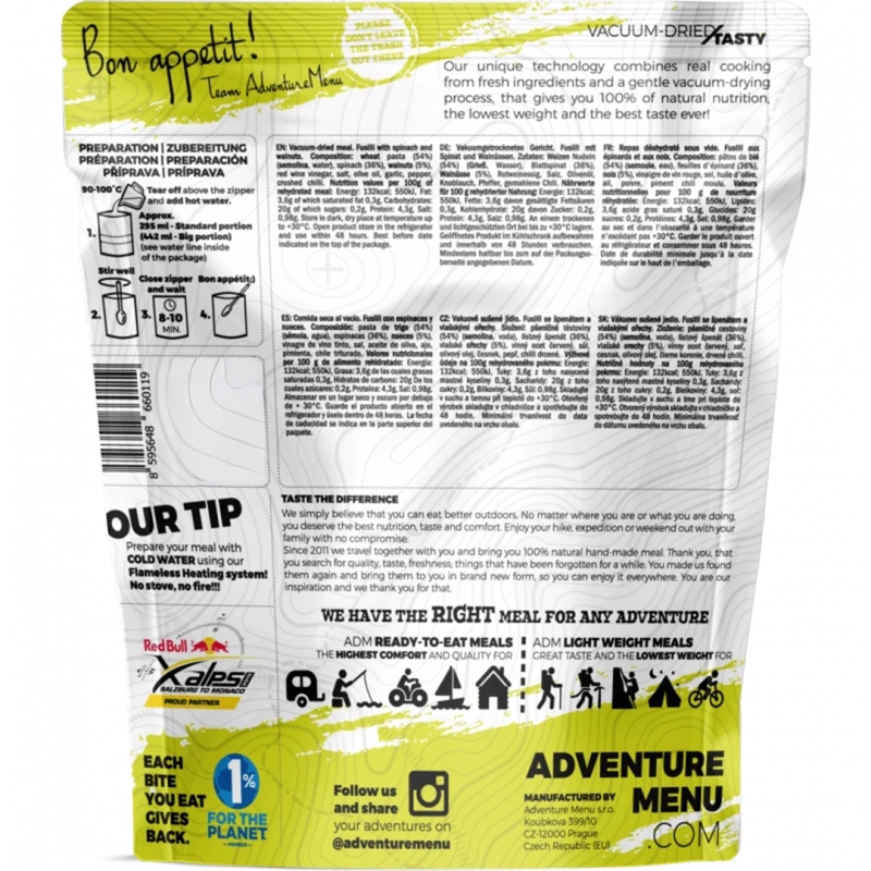 Adventure Menu | Lightweight Vegan hotové jídlo Fusilli se špenátem a vlašskými ořechy (600 g po ohřátí) nabízí minimum hmotnosti při zachování maxima chuti díky metodě šetrného sušení mrazem Vacuum-Dried / Tasty. Jídlo je uvařeno ze 100% přírodních surovin a k přípravě stačí pouze horká voda (MRE – Meal-Ready-to-Eat). ANAREUS nabízí různé příchutě včetně masových i vegan variant.