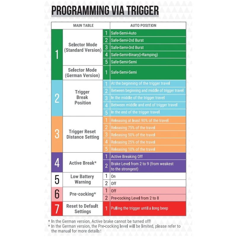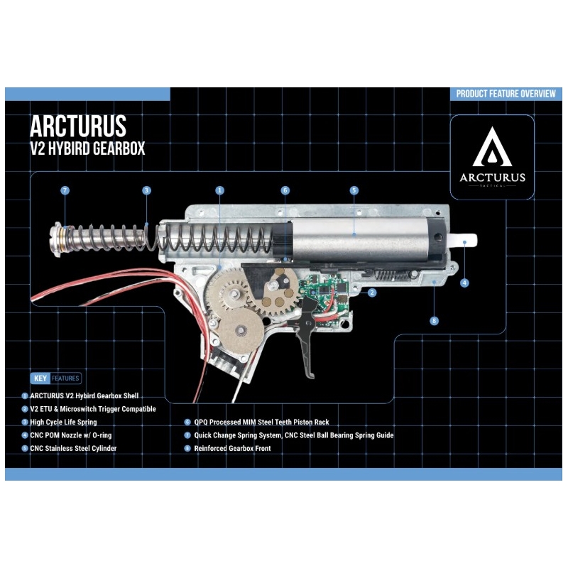 Zbraně Arcturus nejsou ale perfektní jen zvenčí, protože uvnitř je to také extra klasa. Puška je vybavena elektronickou jednotkou ARC FE (FE Optical ETU MOSFET System), která umožňuje nastavení režimu střelby (Semi, 3rd Burst, Binary, Full Auto), 7 úrovní před-natažení pístu (pre-cocking) pro extrémně rychlý výstřel a aktivní brzdou (8 úrovní brždění), která zabraňuje nežádoucímu pohybu pístu po výstřelu. Dále elektronika obsahuje ochranu proti přepětí a varování při nízkém napětí baterie. Třešničkou na dortu je 5 úrovní nastavení citlivosti spouště a 5 poloh resetu spouště.