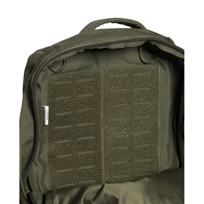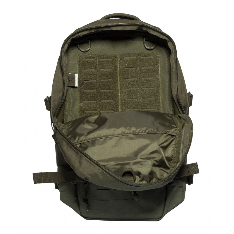 Hlavní přihrádka je vybavena háčkovými panely, které umožňují variabilní uchycení vybavení pomocí kompatibilních organizérů, sumek nebo pouzder. Čelní plochá kapsa je ideální pro dokumenty nebo notebook. Laserem řezaná MOLLE vazba (Laser-Cut) na přední straně i bocích umožňuje rozšíření o další výbavu. Boční kompresní popruhy pomohou přizpůsobit batoh náplni a zamezit pohybu výbavy uvnitř.