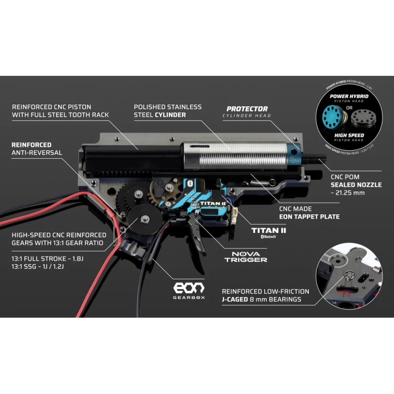 Hledáte ultimátní upgrade pro AEG pušky M4 / AR15 bez nutnosti vlastního skládání a ladění? Chcete maximální spolehlivost, tichý chod a špičkovou elektroniku v jednom celku? Pak je kompletní CNC mechabox EON V2 s jednotkou TITAN II Bluetooth® EXPERT přesně pro vás. Firma GATE totiž připravila jednoduché řešení pro každého, kdo chce bez námahy vylepšit svoji AEG pušku na platformě AR15. Tento kompletně sestavený CNC mechabox EON V2 obsahuje špičkové vnitřní díly a procesorovou jednotku TITAN II EXPERT s Bluetooth® připojením. Vše bylo precizně smontované a odladěné techniky GATE.