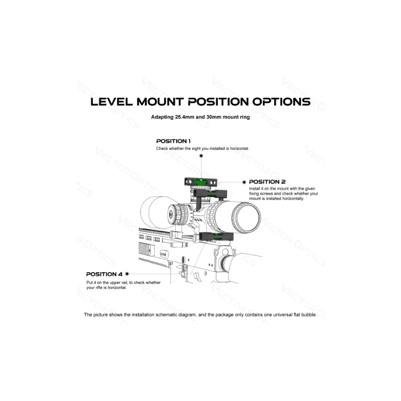 Chcete eliminovat náklon zbraně při střelbě? Potřebujeme zlepšit výsledky střelby na střední a dlouhé vzdálenosti? Hledáte cheat pro vaši airsoftovou sniper pušku, aby kuličky létaly přesněji? Vodováha od Vector Optics je správným řešením. Je určena pro střelce, který chce dosáhnout maximální přesnosti. Díky jednoduchému použití a lehkému kompaktnímu designu vás při manipulaci s puškou nijak neomezí. Snadno ji připevníte na montážní kroužek puškohledu pomocí dodávaných šroubů, což umožňuje univerzální uchycení přímo na pušku. Vodováha je vybavena vzduchovou bublinou, která přesně ukazuje úroveň náklonu zbraně a umožňuje vám tak nastavit pušku do perfektní roviny. Je vyrobena z vysoce kvalitní hliníkové slitiny 6063-T6, běžně používané v leteckém průmyslu, což zaručuje dlouhou životnost a odolnost. Položením vodováhy na horní aretační věžičku puškohledu zajistíte správnou polohu optiky při instalaci (pokud budete mít montážní kroužky nebo jednodílnou montáž položenou na rovné ploše). Viz obrázek níže.