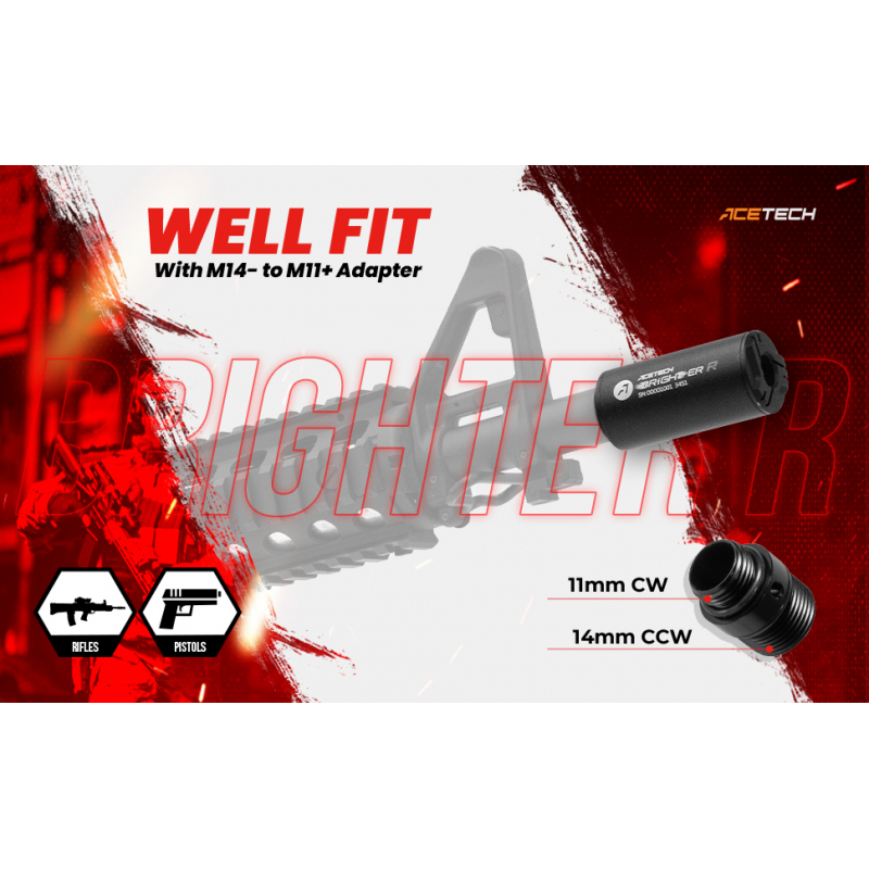 Chcete, aby vaše airsoftová zbraň střílela červené i zelené laserové střely jako ze Star Wars, abyste za šera a v tmavých CQB arénách dobře viděli své zásahy? Hledáte univerzální nasvětlovací tlumič pro pistoli a zároveň ho lze používat i jako vložku do většího tlumiče na delší zbrani? Potom je nasvětlovací tlumič AceTech BRIGHTER R vaším splněním přání. Tento miniaturní tlumič je určený pro nasvětlování Tracer kuliček a navíc je odolný proti prachu a stékající vodě (IP64), takže je ideální i pro venkovní hry. Hlavní inovací je plně bez-tlačítkový design, stačí tlumičem zatřást a ozve se pípnutí. Vestavěná Li-Ion baterie zajistí nasvícení až 20 000 kuliček a po 5 minutách nečinnosti se zařízení samo vypne. O nabíjení se postará USB-C konektor a tlumič je plně nabitý po 2,5 hodinách. Na tlumiči se nachází závit 14 mm CCW (levotočivý) a součástí je redukce na pravotočivý 11mm CW závit, který je běžný u airsoftových pistolí. Varianta R podporuje i červené kuličky, zatímco varianta Brighter C pouze zelené.
