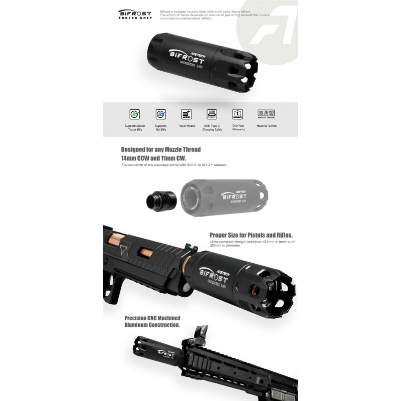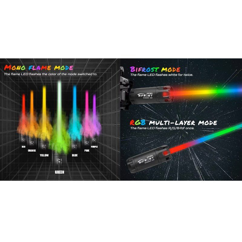 Chcete, aby vaše airsoftová zbraň střílela se skutečným výšlehem plamenu jako reálné zbraně, abyste za šera a v tmavých CQB arénách dobře viděli své zásahy? Nebo zkrátka chcete střílet jako blaster ze Star Wars? Potom je nasvětlovací tlumič AceTech Bifrost vaším splněním přání. Tento tlumič je vybaven nasvětlovací jednotkou a funkcí imitace záblesku z ústí hlavně, což poskytuje působivý efekt plamene při každém výstřelu. Efekt výšlehu je díky RGB osvětlení barevně přizpůsobitelný. Můžete volit z různých barev a režimů jako je Rainbow nebo Dynamic Rainbow. Tlumič je určen pouze pro zelené nasvětlovací kuličky, které senzory tlumiče rozpoznají a ihned nasvítí pro viditelnost i ve tmě. Efekt výšlehu je nejlépe viditelný na plynových zbraních, kde nasvětluje i okolní plyn při výstřelu.