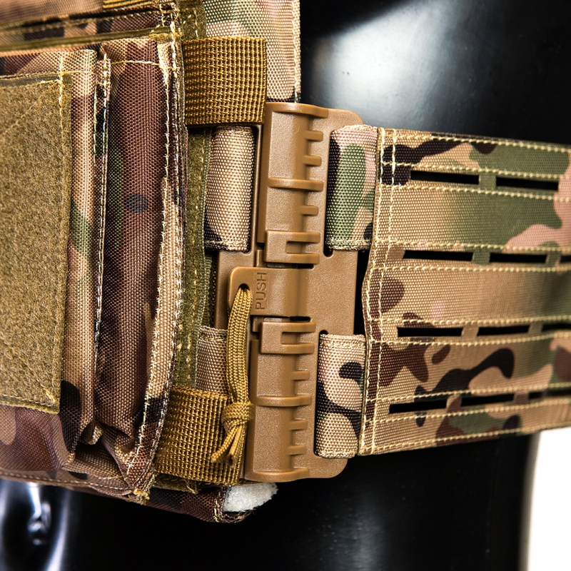 Celý nosič plátů je pokrytý laserem řezanou MOLLE vazbou (Laser-cut), která nejen dobře vypadá, ale i perfektně plní svůj účel. Takže se konečně můžeš ověnčit sumkami jako vánoční stromeček a mít po ruce všechno potřebné.