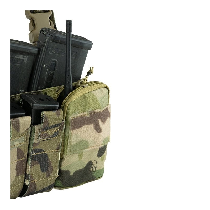 VX Buckle-Up Ready Rig od značky Viper Tactical je lehký, nízko-profilový chest-rig, který vyniká svou modularitou a kompatibilitou s balistickými vestami i samostatným použitím. Je určený pro ty, kdo potřebují rychlý přístup k zásobníkům a příslušenství bez nadbytečné hmotnosti. Přední část tvoří otevřená dvojsumka z pruženky, ideální pro pistolové zásobníky, svítilnu nebo multifunkční nářadí. Levá menší kapsa na zip poslouží například pro radiostanici, zatímco pravá zipová kapsa je vybavena vnitřní pruženkou pro fixaci vybavení a průhledným okénkem na mapu. Obě kapsy mají VELCRO panely pro nášivky.