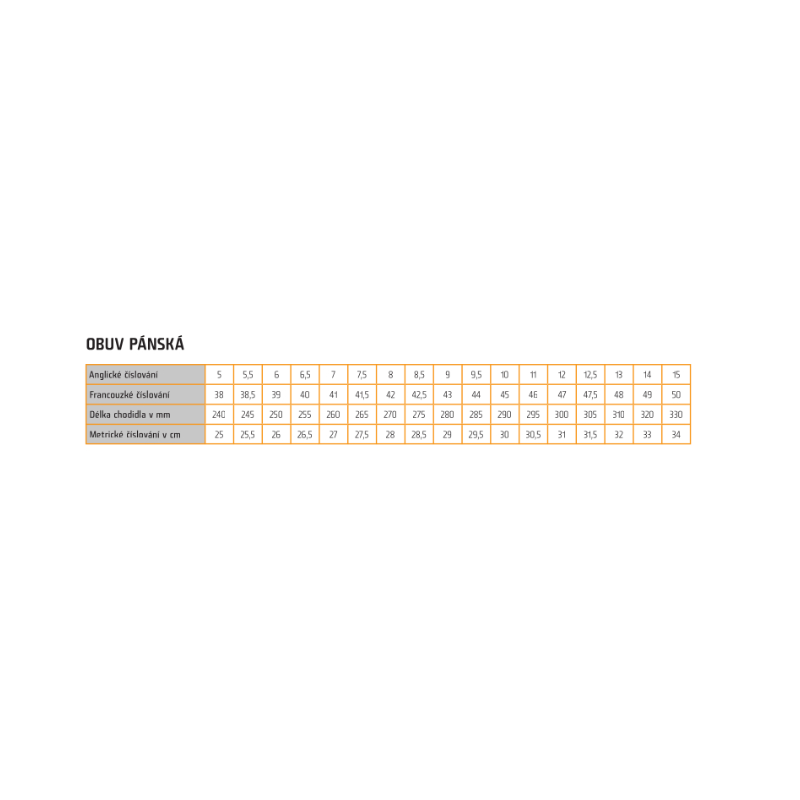 | Velikost | 36 | 37 | 38 | 39 | 40 | 41 | 42 | 43 | 44 | 45 | 46 | 47 | 48 |