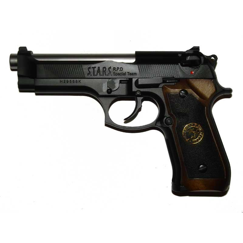 Perfektně propracovaná a celokovová replika pistole Beretta. Inspirací jí byla počítačová hra BIOHAZARD (Resident Evil). Jedná se o plynovou zbraň a při střelbě realisticky napodobuje pohybem závěru střelbu. Tzv. Blow back systém. Plyn se plní do zásobníku s kapacitou 28 kuliček. Střenky jsou s logem S.T.A.R.S. Raccooon Police v imitaci dřeva. Hledí je zdvojené a zvýrazněno. Hlaveň a vodící trn pružiny jsou nerezové.