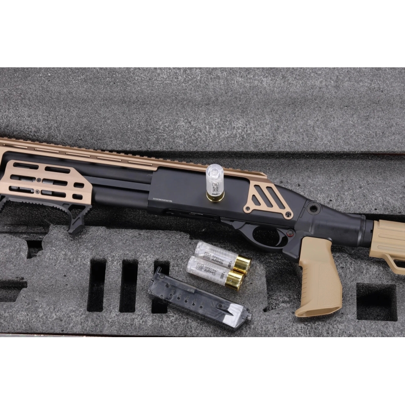 Hledáte kompaktní a lehkou pump-action brokovnici pro CQB? Chcete používat realisticky vypadající patrony na 30 BBs? Potřebujete spolehlivý plynový pohon a možnost volby mezi 3 nebo 6 BBs na 1 výstřel? Poté je brokovnice Specna Arms SA-VGS2 Vapor™ přesně to, co potřebujete. Je navržena jako univerzální CQB brokovnice, která kombinuje kovové konstrukční prvky s odolnými polymerovými doplňky. Pohon zajišťuje airsoftový plyn Green Gas (plynový zásobník je integrovaný ve zbrani). Zbraň má navíc zesílenou trysku pro stabilní dávkování plynu a pro vyšší spolehlivost. Při nabíjení se pod okénkem pro patrony nachází přepínač střelby, na kterém si vyberete mezi 3 nebo 6 BBs na 1 výstřel. Bezpečnost zajišťuje pojistka proti náhodnému výstřelu a tlačítková pojistka okénka pro patrony. Brokovnice VAPOR™ je stvořena pro rychlou manipulaci v CQB uzavřených prostorech, snadné přebíjení a perfektní výkon.
