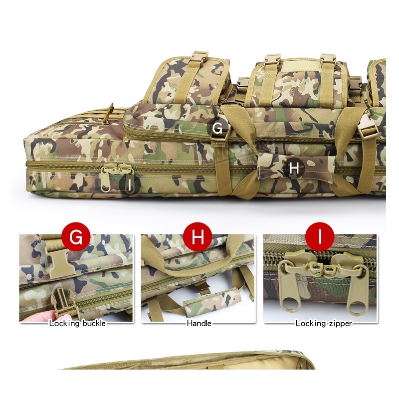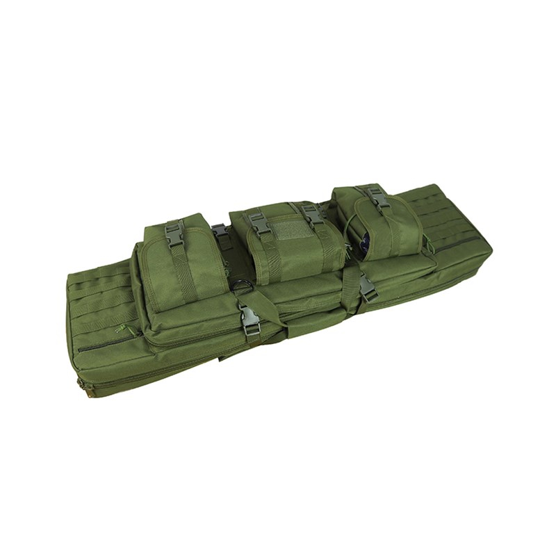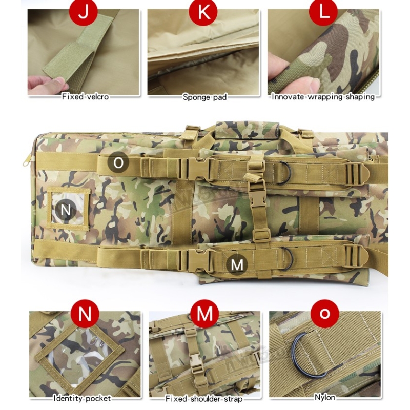 Víceúčelová transportní brašna od WoSporT má hlavní oddíl, který pojme 2 dlouhé zbraně oddělené vnitřní polstrovanou přepážkou a jištěné páskami na suchý zip, takže nedochází k jejich kontaktu během přepravy. Druhý velký zipový oddíl poskytuje prostor například pro 2 pistole nebo kompaktní PDW či SMG. Vnější část nabízí MOLLE panely, 2 zipové kapsy a 3 prostorné kapsy se suchým zipem a nastavitelným bungee stahováním. Konstrukce z nylonu 600D je odolná proti oděru i vlhkosti, zatímco vnitřní pěnové polstrování tlumí nárazy. Brašnu lze nosit jako batoh díky polstrovaným zádovým popruhům a hrudnímu pásu. Dvoucestné zipy mají oka pro visací zámek pro zvýšení bezpečnosti. Brašnu doporučujeme jako univerzální tašku na airsoft, protože do ní dáte svoji hlavní zbraň se zásobníky, záložní PDW zbraň nebo pistoli, náhradní primární zbraň pro případ poruchy té hlavní, kuličky, baterie, svačinu i základní nářadí a nabíječku. Brašna splňuje požadavky zákona o zbraních, který nařizuje, že zbraň nesmí být viditelně nošena na veřejnosti. Zkrátka ideální obal i na vícedenní airsoftové akce. Na výstroj a oblečení doporučujeme zase naši ARACHNID tašku s objemem 42 litrů.