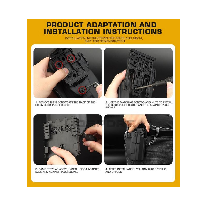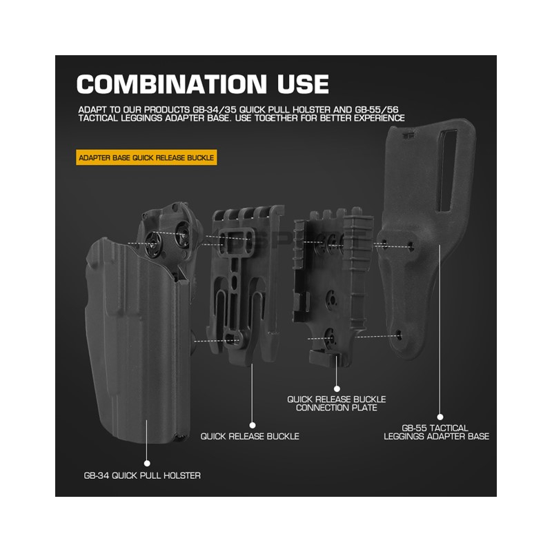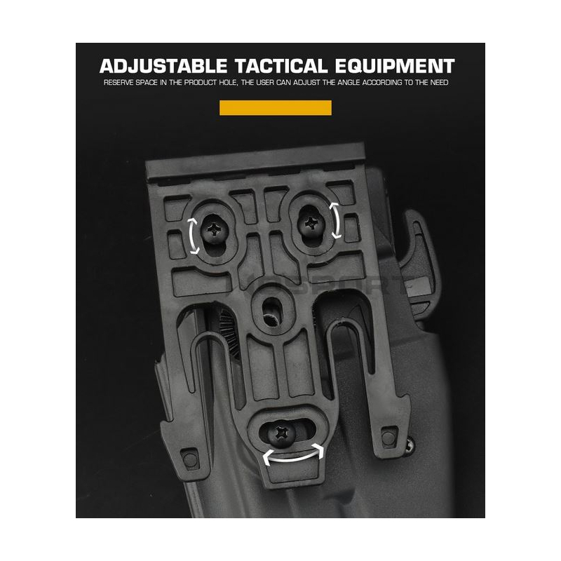 Součástí balení je 6 šroubů pro upevnění holsteru i základny, což vám usnadní instalaci. Set se skládá z plastové základny, kterou lze přišroubovat na opaskové, stehenní nebo MOLLE platformy, a odnímatelné QD montážní desky, na kterou se připevňuje samotné pouzdro.