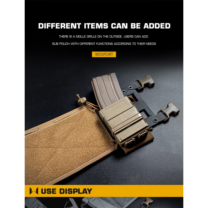 WoSporT taktický Micro Chest Rig MK4 v Coyote provedení je lehký modulární chest rig pro maximální variabilitu výbavy. Nabízí inserty na zásobníky M4 / AK a 40mm granáty, boční kapsy na radiostanici a břišní sumku typu dangler (drop down). Díky VELCRO systému a H řemení si ho snadno přizpůsobíte podle mise.