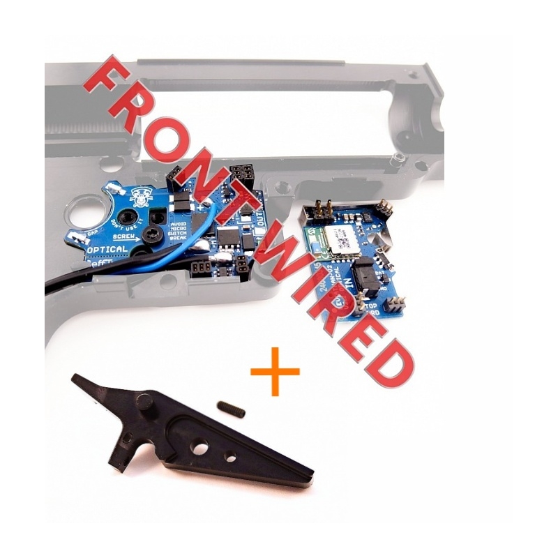 Leviathan V2 Optical je elektronická ETU jednotka s Bluetooth, která je navržená pro instalaci do mechaboxu V2 a V2.5 podle TM standardu. Díky optickým senzorům pro detekci výstřelu a přepínače režimu střelby a extrémně krátkému spínači (pouhých 0,13 mm) umožňuje nastavit reálný hair trigger mód. Systém Real Feel Trigger System (RFTS) s pružinou simuluje odpor spouště reálné zbraně a přidává reset po výstřelu. Pomocí aplikace JeffTron můžete v reálném čase konfigurovat režimy střelby, kadenci, aktivní brzdu, před-natažení pístu, virtuální zásobník a mnoho dalšího. Vstupní i výstupní port podporují připojení externích doplňků jako jsou svítilny, elektrické zásobníky nebo senzor prázdného zásobníku. Jednotka je chráněna konformním lakem. Je kompatibilní s vysokokadenčními sestavami včetně DSG kol a je plně připravena pro Brushless motory jako Warhead. Všechny změny provedené v aplikaci se ukládají v reálném čase do paměti jednotky. Navíc k této jednotce dostanete i CNC hliníkovou spoušť od Retro Arms, která má šroub pro nastavení výchozí pozice a stylový vzhled.
