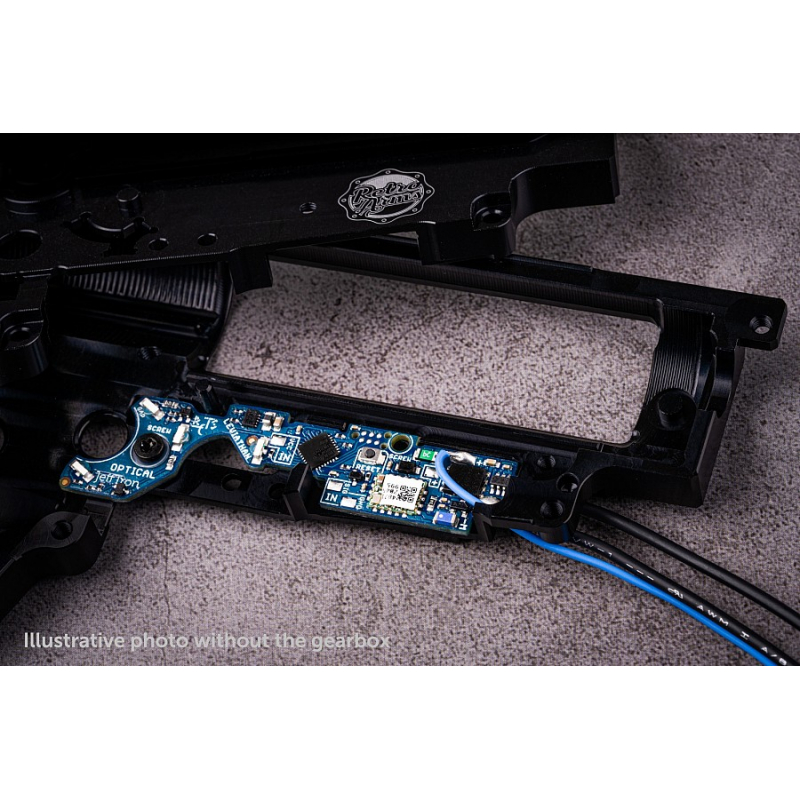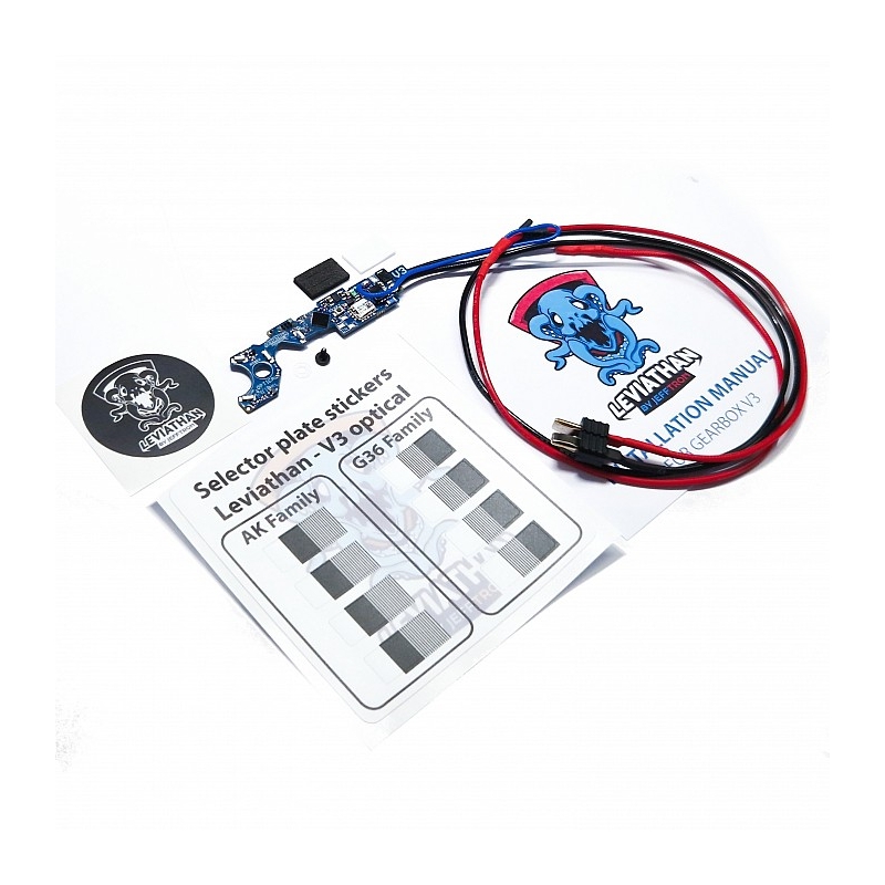 Leviathan V3 Optical je elektronická ETU jednotka s Bluetooth, která je navržená pro instalaci do mechaboxu V3 podle TM standardu. Díky optickým senzorům pro detekci výstřelu a přepínače režimu střelby a možnosti přidat pěnovou podložku lze nastavit reálný hair trigger mód. Systém Real Feel Trigger System (RFTS) s pružinou simuluje odpor spouště reálné zbraně a přidává reset po výstřelu, jedná se systém, který byl vyvinut po konzultaci s puškaři. Pomocí aplikace JeffTron můžete v reálném čase konfigurovat režimy střelby, kadenci, aktivní brzdu, před-natažení pístu, virtuální zásobník a mnoho dalšího. Vstupní i výstupní port podporují připojení externích doplňků jako jsou svítilny, elektrické zásobníky nebo senzor prázdného zásobníku. Jednotka je chráněna konformním lakem. Je kompatibilní s vysokokadenčními sestavami včetně DSG kol a je plně připravena pro Brushless motory jako Warhead. Všechny změny provedené v aplikaci se ukládají v reálném čase do paměti jednotky. Navíc k této jednotce dostanete i modul pro nastavení spouště do režimu Single-Stage (klasická airsoftová spoušť vhodná pro soutěžní střelbu) a Two-Stage, která se hodí pro reálnou simulaci bodu zlomu spouště, než dojde k výstřelu. Tento modul je vyroben z 3D tisku a určen pouze pro mechabox V3 s jednotkou Leviathan. Přináší ještě silnější zážitek ze stisku spouště než RFTS systém.