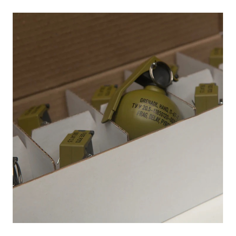 Airsoftový ruční granát P-67G NATO od PYROSOFT v provedení hnědá Khaki. Realistická replika M67 FRAG s náplní G – hrách a vosk. Pyrotechnika třídy P1 (EN 16263-3), prodej pouze od 18 let s osobním odběrem. Reálná páková pojistka pro trénink manipulace jako u skutečného granátu. Vodotěsnost IP66, odolá dešti i krátkému ponoření.
