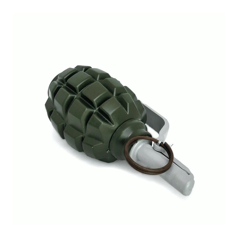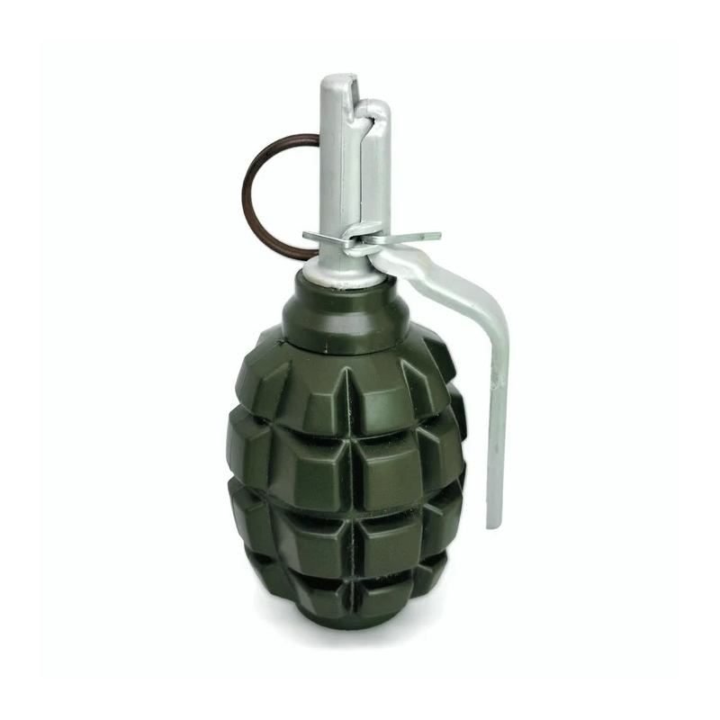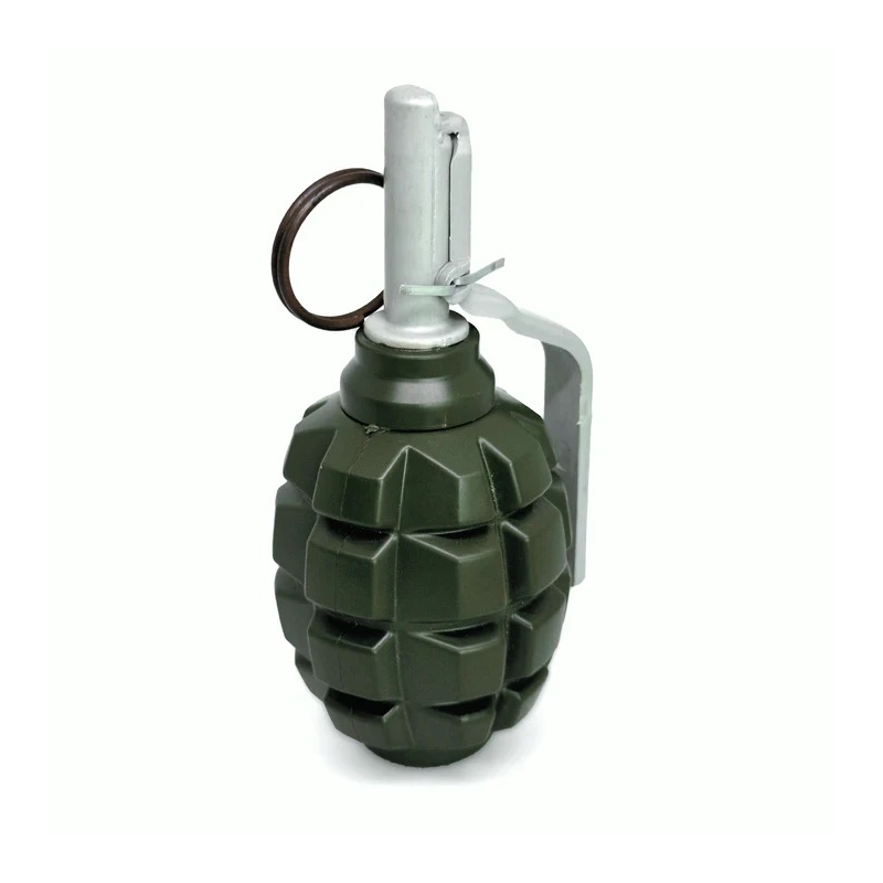 Airsoftový ruční granát Pyro-F1M od PYROSOFT v provedení zelená. Realistická replika sovětského F1 s náplní M – křídový prach a sádra. Pyrotechnika třídy P1 (EN 16263-3), prodej pouze od 18 let s osobním odběrem. Reálná páková pojistka pro trénink manipulace jako u skutečného granátu. Vodotěsnost IP66, odolá dešti i krátkému ponoření.