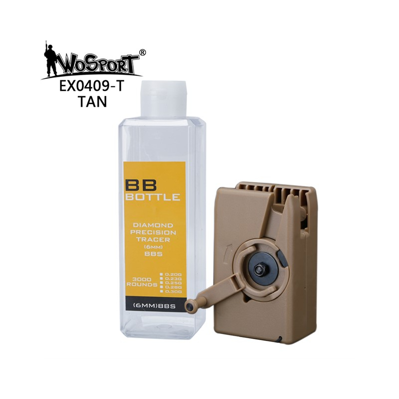 Rychloládovačka Lever Bottle od firmy WoSport je nezbytnou součástí výbavy každého hráče airsoftu. Rychlým otáčením klikou lze téměř každý tlačný zásobník M4/16 velmi rychle naplnit.