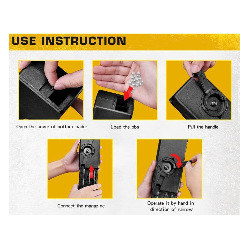 WoSporT LEVER je rychloládovačka inspirovaná oblíbeným systémem M12 ODIN, která výrazně zjednoduší manipulaci se zásobníky během hry. Stačí nasypat BBs, nasadit zásobník a otáčet klikou, bez zdlouhavého mačkání klasické plničky. Díky kapacitě až 1000 BBs zvládnete nabít více zásobníků bez přerušení. Konstrukce je dostatečně kompaktní, aby se vešla do sumky na 2 zásobníky M4, takže ji můžete mít neustále po ruce. Základní šachta je určena pro M4 / AR15 zásobníky, ale pomocí adaptérů (nejsou součástí) lze plnit i AK, MP5 nebo G36 zásobníky.