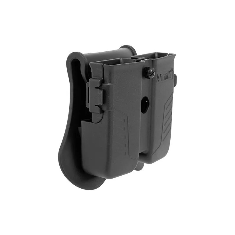 Univerzální pouzdro na 2 pistolové zásobníky od Amomax je vyrobeno z odolného high-tech polymeru a umožňuje nastavit svor pomocí bočních zámků na pouzdře bez použití nástrojů. Díky tomu si můžete přizpůsobit sevření zásobníku na míru konkrétnímu modelu a požadované síle svoru.