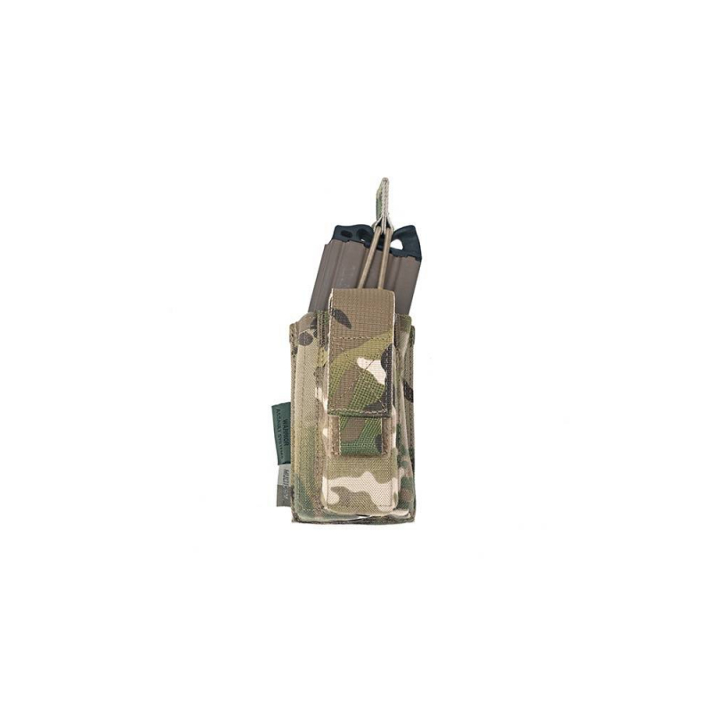 Tato kombinová sumka od britské značky Warrior Assault Systems je určená pro rychlé tasení zásobníku typu AR15 / M4 (5.56 mm) a bezpečné nošení dvouřadého pistolového zásobníku nebo multitoolu. Sumka patří do řady Elite Ops, která je známá svou spolehlivostí a prověřena v reálném nasazení. Puškový zásobník je v sumce jištěn pomocí elastické pruženky s táhlem (Pull Tab), která zabraňuje samovolnému vypadnutí a přitom umožňuje velmi rychlé přebíjení v krizových situacích. Vnitřní strana sumky je podšitá zdrsněným protiskluzovým materiálem, čímž se ještě více snižuje riziko ztráty zásobníku při pohybu. MOLLE kompatibilní popruhy na zadní straně umožňují snadné upevnění na nosič plátů, vestu nebo opasek. Pistolový zásobník je jištěn krycí chlopní na VELCRO suchý zip proti nečistotám.