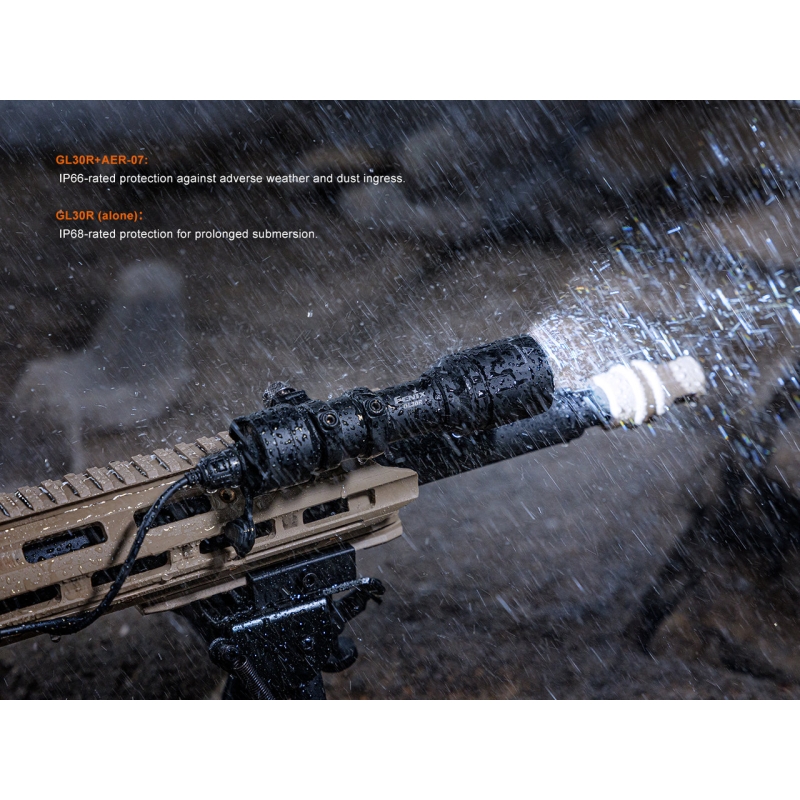 Fenix GL30R je svítilna navržená pro montáž na dlouhé zbraně a nabízí kombinaci vysokého výkonu, odolnosti a jednoduchého ovládání. Světelný tok 800 ANSI lumenů ve spojení s úzce zaostřeným kuželem dosahuje dosvitu až 630 metrů. Svítilna využívá Li-ion akumulátor 18650 (3400 mAh) s možností dobíjení přes USB-C, případně lze použít i 2 baterie CR123A. Ovládání je možné zadním spínačem nebo dálkovým spínačem AER-07 s pojistkou proti nechtěnému sepnutí. Díky přiloženým montážím ji snadno připevníte na RIS lištu nebo do M-LOK slotu v přímé i offset pozici. Robustní tělo z hliníkové slitiny zvládne náročné podmínky v terénu i na střelnici.