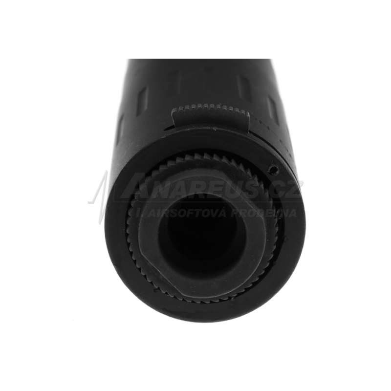 V balní je kovový kompenzátor, který si na zbraň našroubujete. Má klasický levotočivý závit M14 (-14mm).