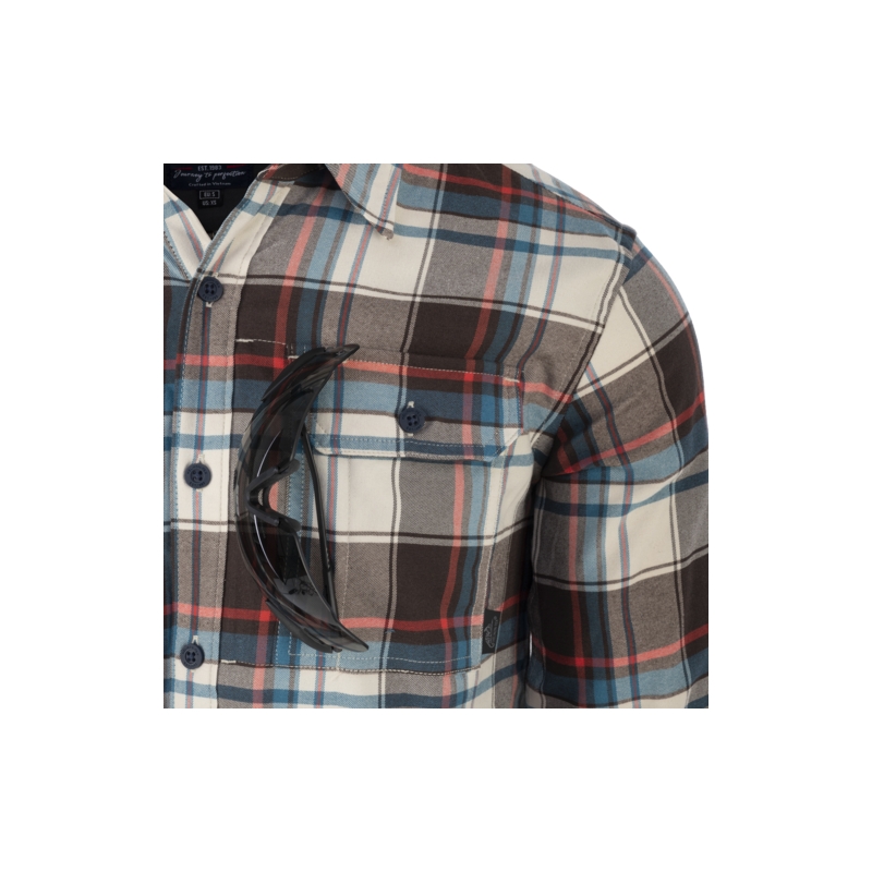 Košile se zapíná pomocí odolných plastových knoflíků. Na hrudi naleznete dvojici hlubokých kapes uzavíraných pomocí chlopně s knoflíkem. Tyto kapsy navíc disponují malým průchodem sloužícím k zavěšení brýlí.