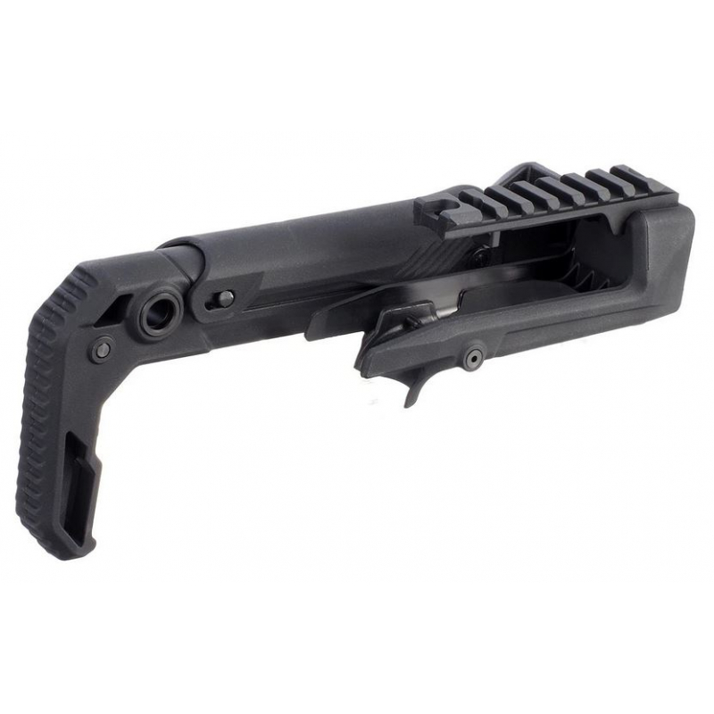 Sklopná, délkově stavitelná pažba s RIS lištou pro kolimátor.