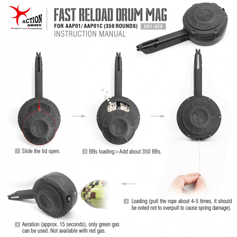 Zásobník je plněn Green Gasem skrze ventil na spodní straně (doba plnění zhruba 15 vteřin) a BBs se vkládají přes boční otvor v horní části bubnu. Konstrukce je jednoduchá a robustní, žádné zbytečné prvky, které by překážely při použití. Samotné natáčení je pomocí kovového lanka (stačí 4-5 zatažení pro plné natočení).