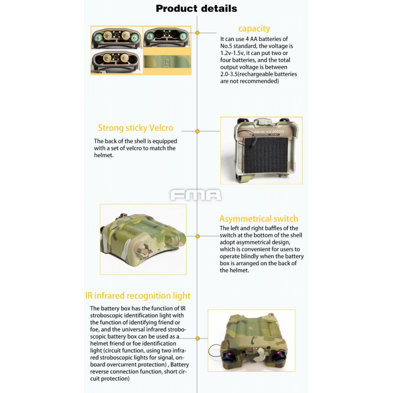 This battery pack from FMA is designed for use with night vision devices like the PVS-31 and other similar models. It features an IR identification light (Personal Beacon) with two operational modes (steady/strobe), allowing for identification of friendly units on the battlefield.