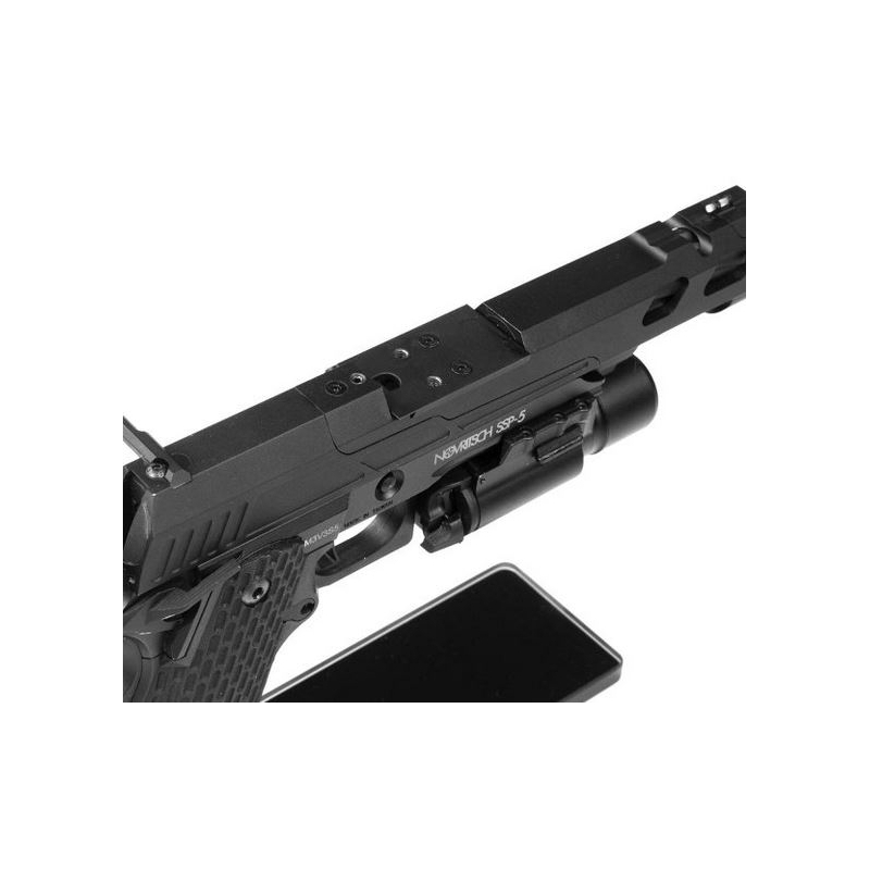 Airsoft Gas Pistol SSP5 Hi-Capa by Novritsch in black. Competition 6" version tuned to the max. Extreme accuracy thanks to a 6.01 mm barrel and TDC hop-up system. Strong blowback and realistic slide cycling. CNC split-slide for faster shooting. Full-steel trigger mechanism.