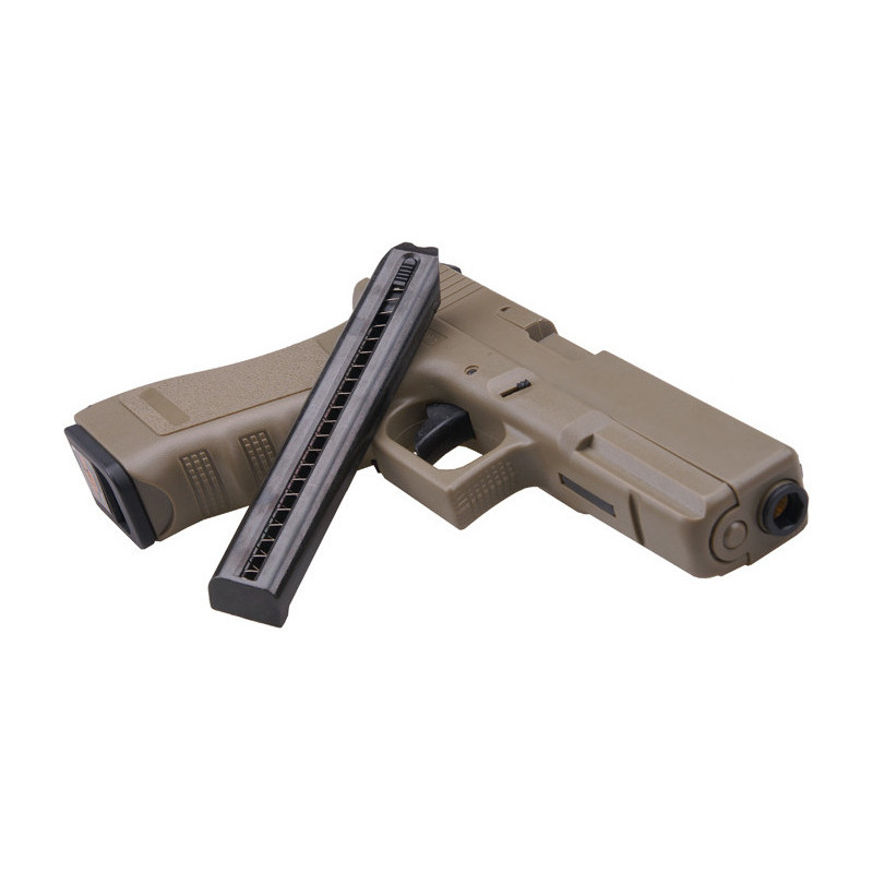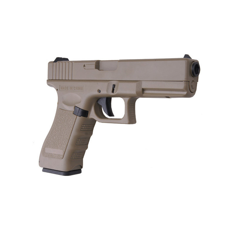 It includes the CYMA R18C AEP airsoft pistol in Tan.