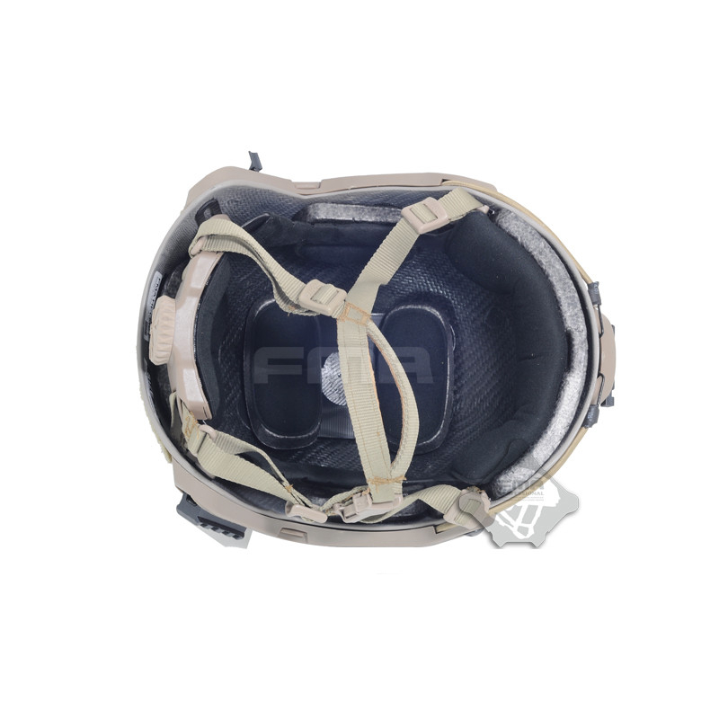 Aramid FAST Prevent L3A Helmet by FMA in tan. The helmet features an adjustable size using the Occ-Dial Liner adjustment wheel. Available in sizes M-L (52-61 cm) and L-XL (55-64 cm). The helmet is equipped with ARC side rails, VELCRO panels and has a NVG mounting plate with bungee cords. The helmet does not provide ballistic protection.