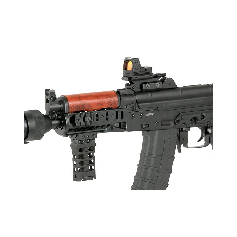 Looking for a durable and lightweight handguard to replace your original plastic one while providing a full-length 20 mm RIS rail for accessories? Need a precisely CNC-machined upgrade that fits compact AK-74U platforms perfectly? Want a shorter handguard that offers enough mounting space while keeping proper balance and authentic style? Then the 5KU CNC ZB-11 Lower Handguard is your ideal choice. Designed specifically for AK-74U replicas (not compatible with standard AK-47, AKM, or AK-74 models), it ensures a tight fit thanks to precise CNC machining and provides a solid base for RIS accessories. The integrated 20 mm standard RIS rail allows for mounting grips, flashlights, or bipods. Made from lightweight aluminum, it significantly reduces weight compared to steel parts while maintaining durability and offering a balanced, tactical look ideal for modern AK-74U builds.